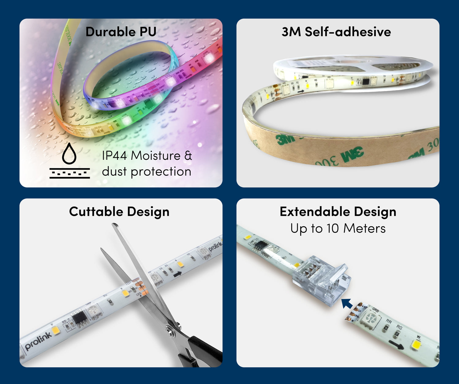 You can cut or extend the LED strip to 10 meters with the strip connectors, bend and curve it around corners, easily attach them to the back of screen monitors, cabinets, or stick them onto any solid surface.