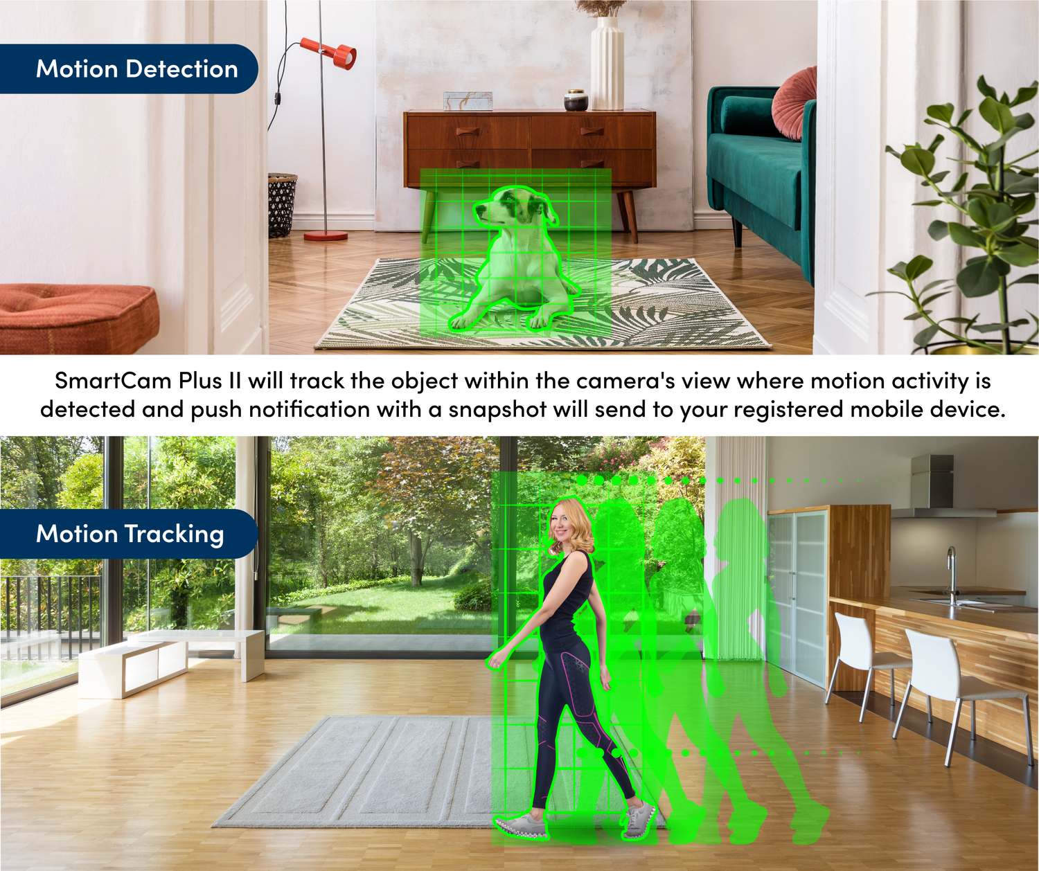 Designed to rotate in any direction, the HD pan & tilt Wi-Fi camera uses a panoramic view that lets you point to any target area of your choice in the field of view with just a tap on your phone.
